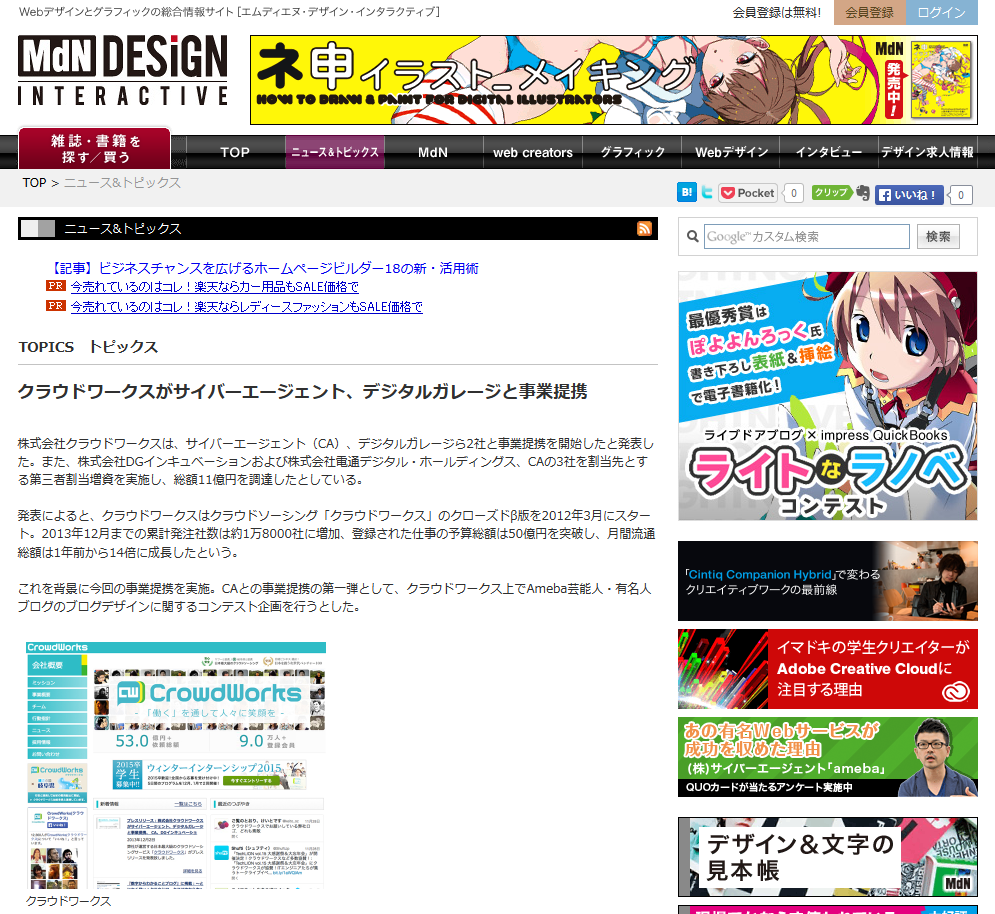 『MdN Design Interactive』に掲載:~クラウドワークスがサイバーエージェント、デジタルガレージと事業提携~