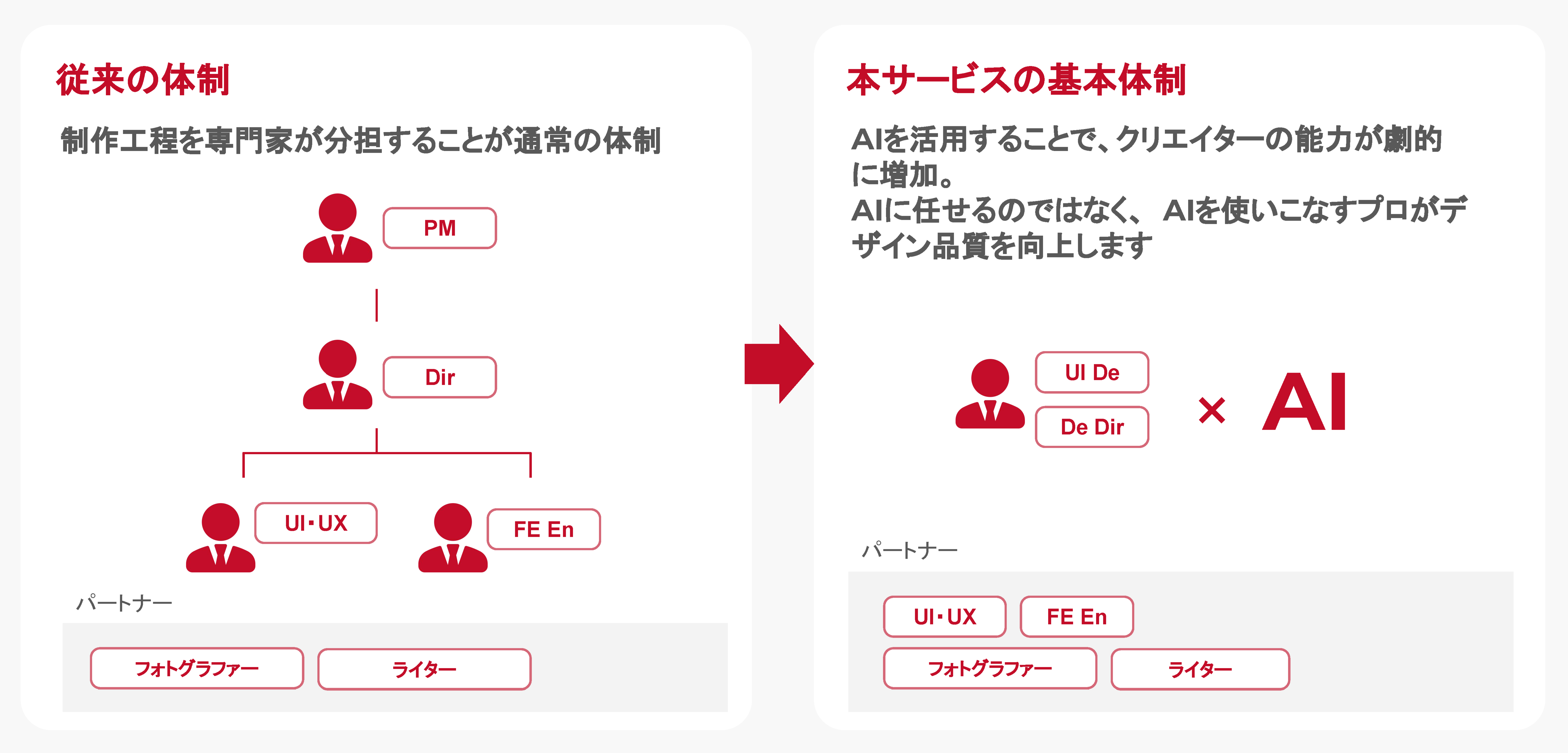AI活用により、各分野の担当者が入れ替わる分業制を捨て、1〜2名の専属クリエイターが直接顧客と向き合う体制を構築することができます。
