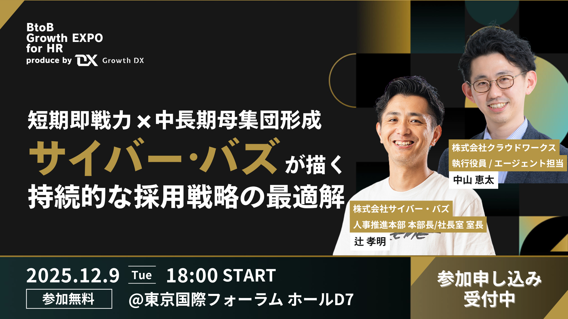 当社が運営する、プロフェッショナルなフリーランス人材に特化したエージェントサービス「クラウドワークス エージェント」は、2025年12月9日(火)に東京国際フォーラムで開催されるカンファレンス「BtoB Growth EXPO for HR」に協賛しブースを出展します。また、本カンファレンス内のトークセッションにて当社執行役員/エージェント担当の中山恵太が登壇することをお知らせいたします。