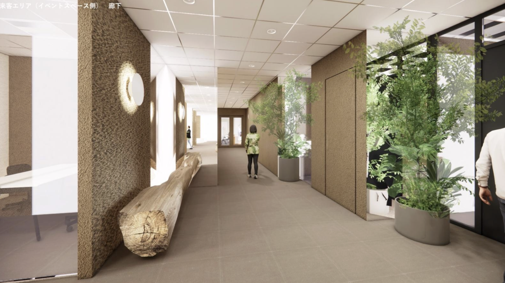 オフィスエントランスは植物が育つ土をイメージしてデザインされており、土と調和が感じられるように観葉植物を設置していきます。また壁の一部にミラーを使うことで、空間に奥行きと広がりを感じさせるオフィスデザインを目指しています