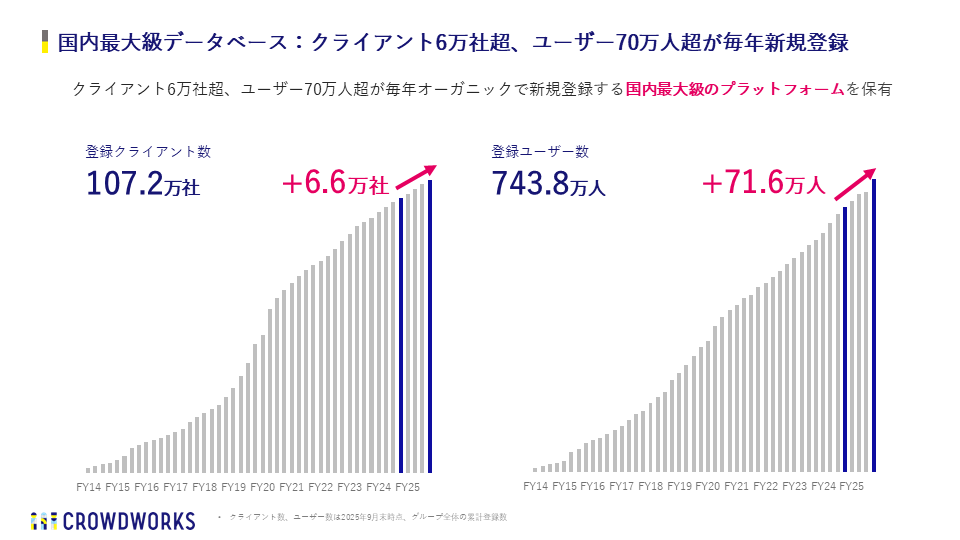 当社は上場から現在までに当社とシナジーのある14社をM&Aによってグループに加えています。今回の調査では、クラウドワークスグループ全体で「フリーランス登録数 No.1」を獲得しました。2025年9月末にグループ累計の登録ユーザー数は743.8万人を更新し、国内最大級の人材データベースを保有する当社グループが、次世代の働き方を志向するフリーランスや副業人材に選ばれるキャリア形成の基盤となっていることを表しています。