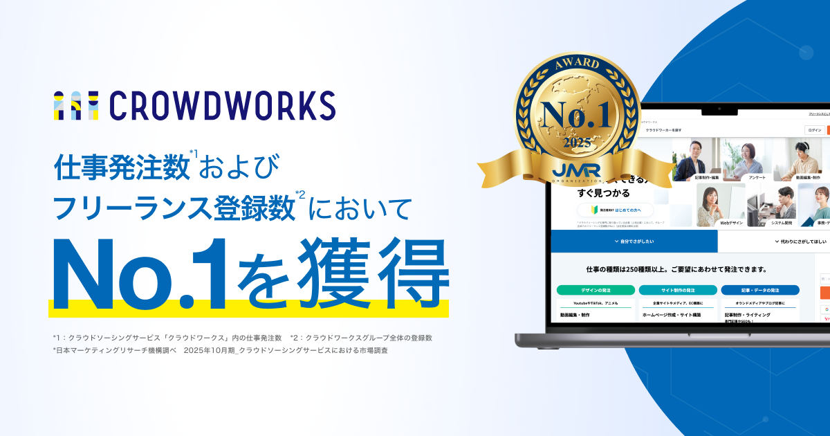 この度、クラウドワークスは仕事発注数・フリーランス登録数No.1となりました。これもひとえに、これまでご利用くださった発注者の皆さま、そして多様なスキルで支えてくださったワーカーの皆さまのおかげです。心より感謝申し上げます。私たちは今後も、より多くの企業が安心して発注できる環境を整え、仕事の機会を拡大してまいります。日本全体で人手不足が深刻化するなか、クラウドワークスは「人と仕事の新しいつながり」を生み出すことで、その課題解決の一翼を担っていきます。