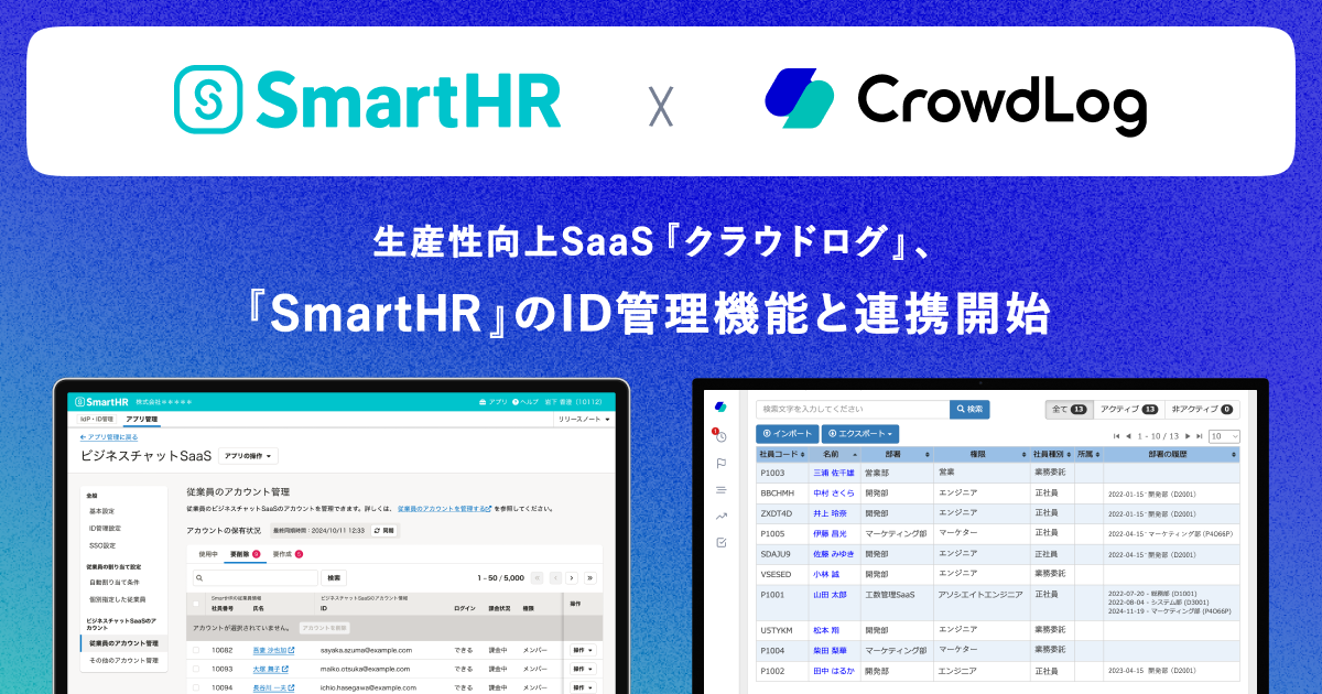 フリーランス業界最大級プラットフォーム(登録ワーカー含む登録ユーザー数*700万人・登録企業100万社)を基盤に、IT人材&DXコンサルティングサービスを提供する株式会社クラウドワークス(本社:東京都渋谷区 代表取締役社長 兼 CEO:吉田 浩一郎 以下「当社」)は、企業の働き方を見える化する生産性向上SaaS「クラウドログ」において、株式会社SmartHR(本社:東京都港区 代表取締役CEO:芹澤 雅人 以下「SmartHR社」)が提供するクラウド人事労務ソフト「SmartHR」の「ID管理」機能と連携(以下、本連携)を開始したことをお知らせします。