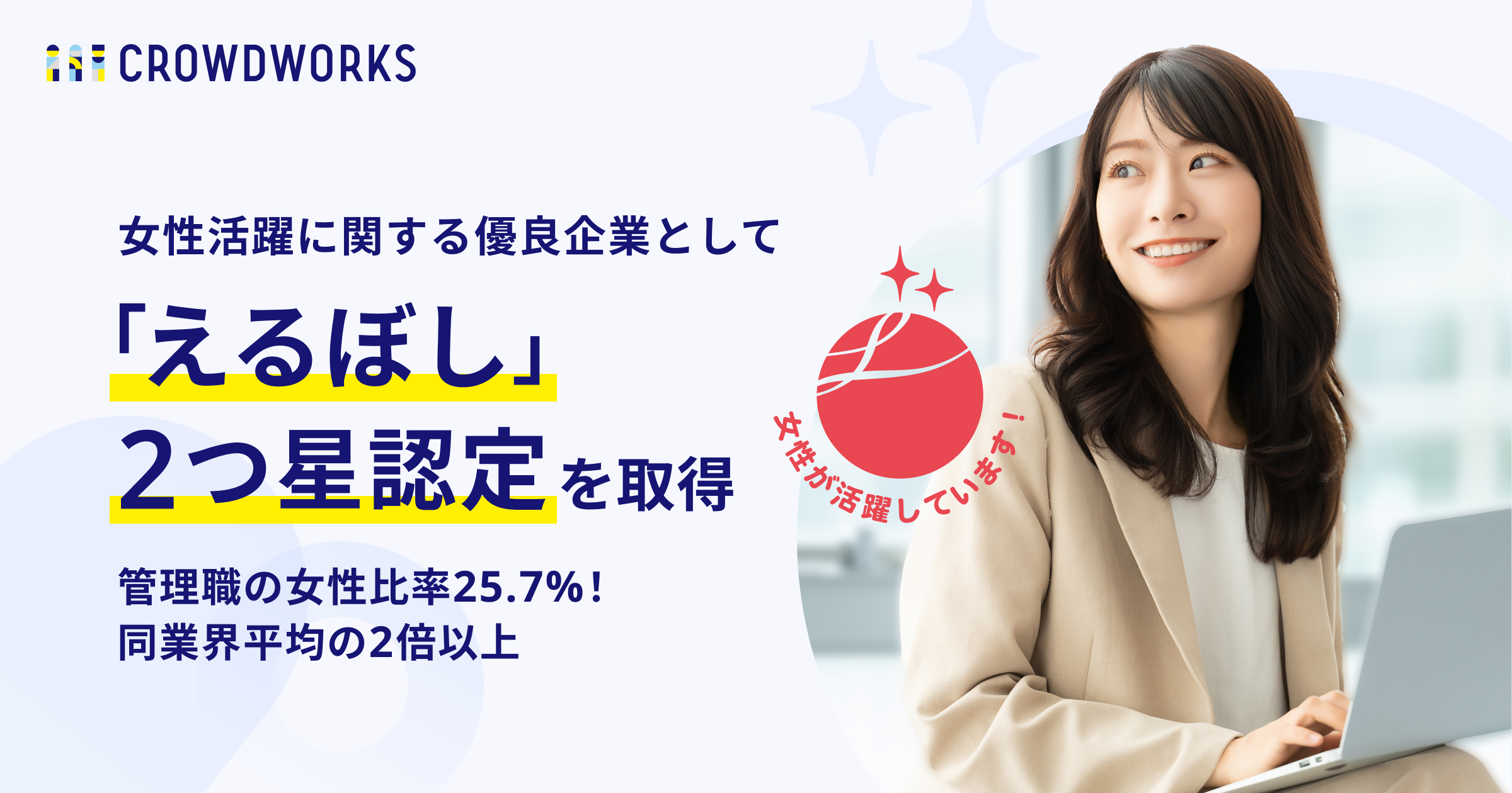 フリーランス業界最大級プラットフォーム(登録ワーカー含む登録ユーザー数*1700万人・登録企業100万社)を基盤に、IT人材&DXコンサルティングサービスを提供する株式会社クラウドワークス(本社:東京都渋谷区 代表取締役社長 兼 CEO:吉田 浩一郎 以下「当社」)は、女性の活躍推進に関する取り組みに関し、一定の要件を満たした優良企業として、厚生労働大臣より「えるぼし」認定(2段階目、2つ星)を取得しました。