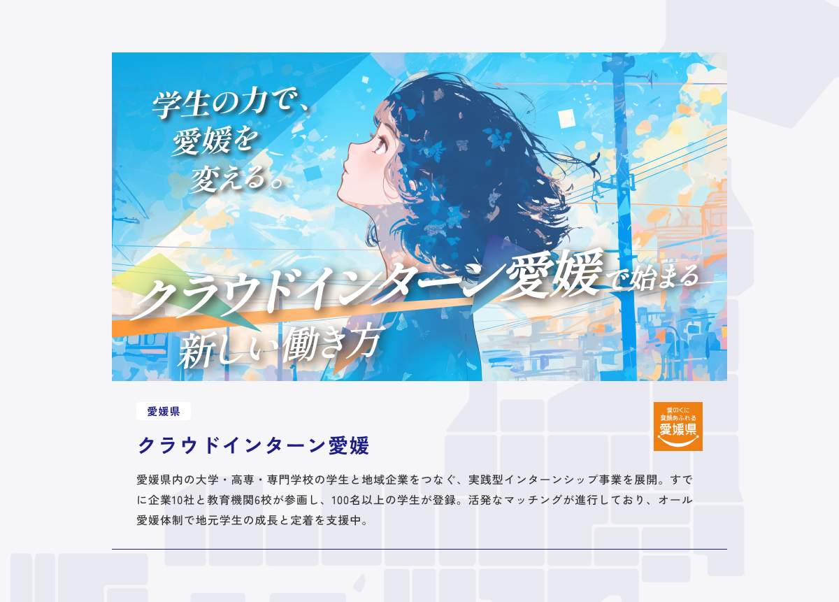 地域創生へ向けた取り組みの一つとして、愛媛県から業務を受託し、地域密着型・超実践型インターンシップ「クラウドインターン」を実施しました(*9) 。