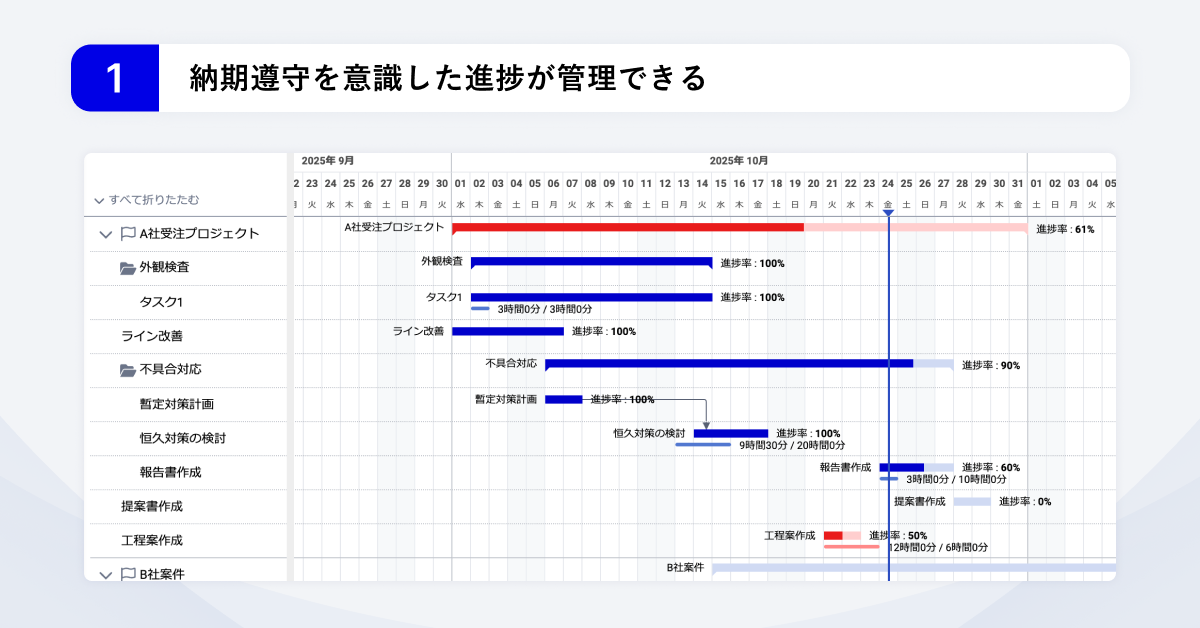 この課題に対し、予定工数と実績進捗をガントチャート上で同一画面に可視化することで、プロジェクトの遅延やリソース不足などの問題発生の早期発見と迅速な対応を容易にし、プロジェクト成功への貢献を目指します。