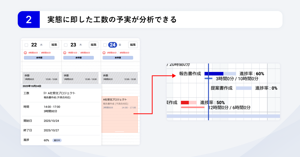各メンバーが入力した実態工数データを自動集計し、プロジェクトの予測工数との差分を明らかにします。これにより、リソース配分の最適化や、より精度の高い工数見積もりを可能にし、プロジェクトの収益性向上に貢献します。