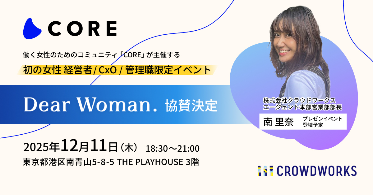 当社が運営する、即戦力IT人材のダイレクトマッチングサービス「Tech Direct(テックダイレクト)」は、2025年12月11日(木)に行われる、働く女性のためのコミュニティ「CORE」が主催する企画「Dear Woman.」に協賛します。また、本イベント内にて当社クラウドワークス エージェント本部 営業部部長 兼 テックダイレクト事業責任者の南 里奈が登壇することをお知らせいたします。
